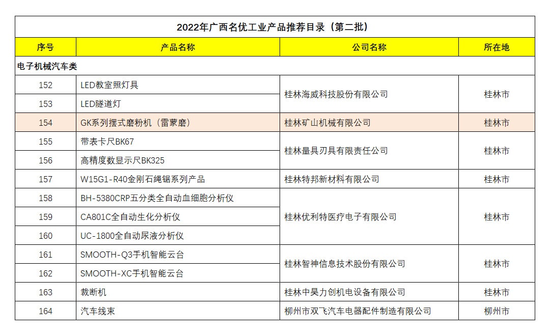 日前,通過自治區工業和信息化廳發布關于廣西名優工業產品推薦目錄(第二批)的公示,桂林礦山機械有限公司擺式磨粉機產品成功入選《廣西名優工業產品推薦目錄》(第二批)。