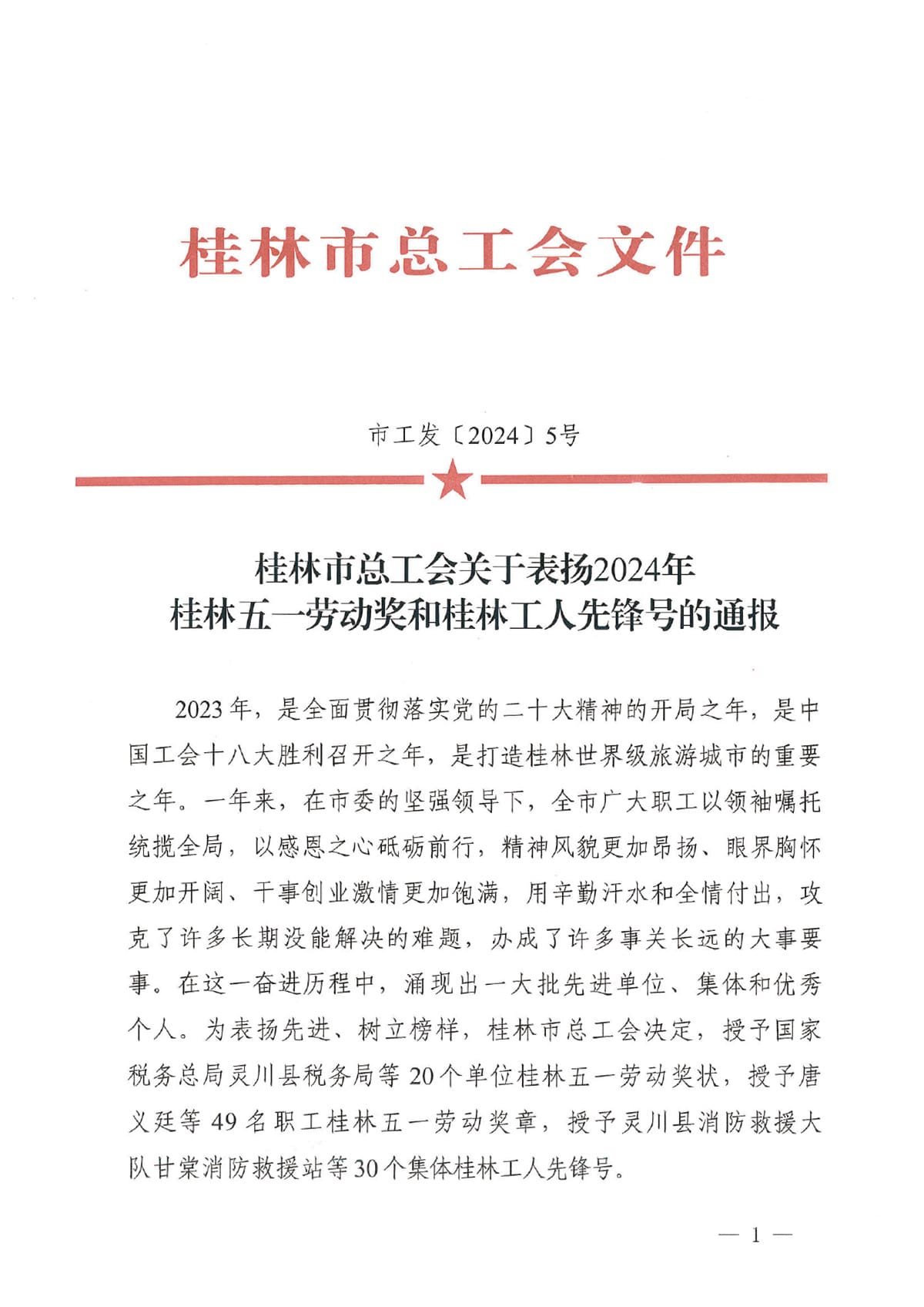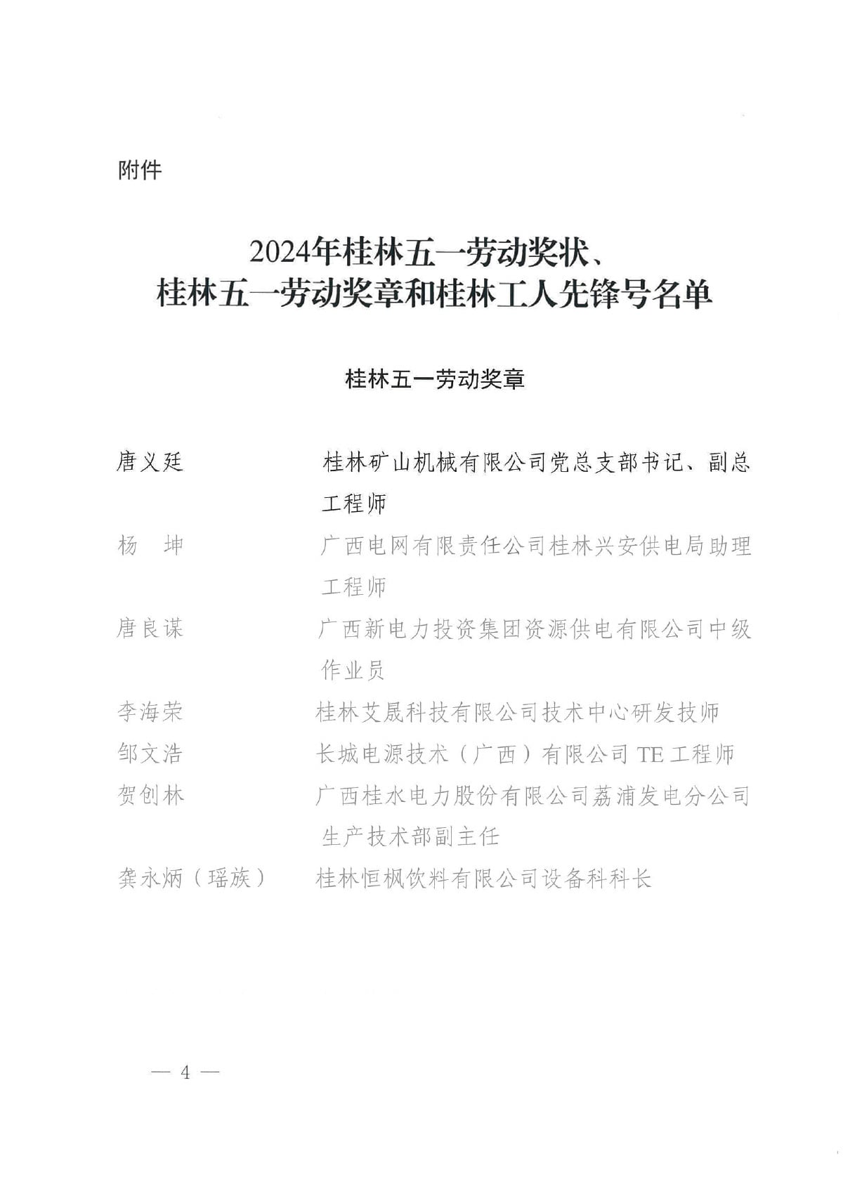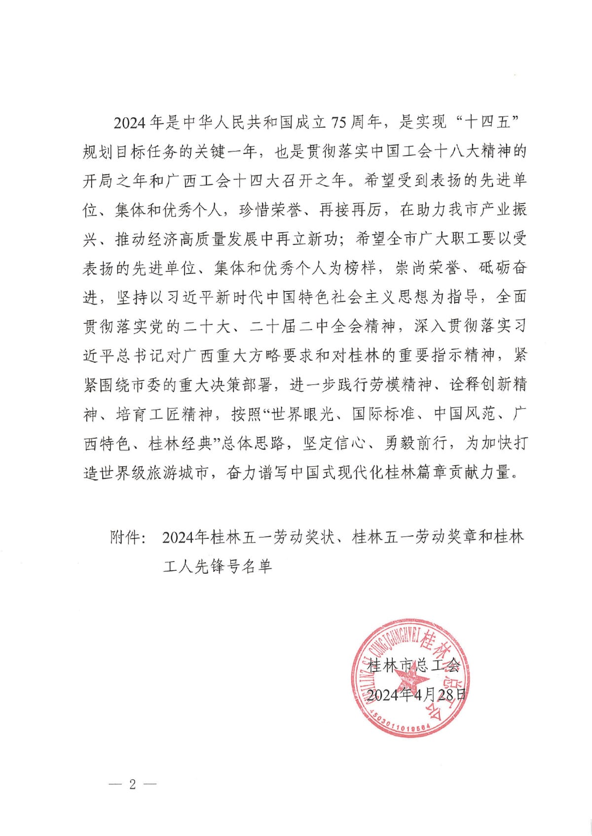 為表揚先進、樹立榜樣。近日,桂林市總工會發文關于表揚2024年桂林五一勞動獎和桂林工人先鋒號的通報,決定授予唐義廷等49名職工桂林五一勞動獎章。